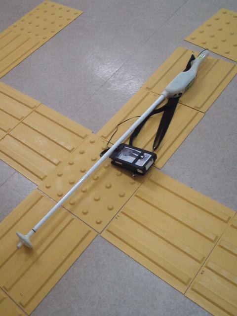 音声案内対応の白杖 春日部市の㈱BOTH 辺見さんが来所され、「音声案内対応の白杖」の体験をしました。 点字ブロックにICチップがはってあり、そこの部分を「音声案内対応の白杖」で触れるとブルブルと揺れて、その後案内音声が流れます。 体験後、利用者の方から質問や改良点、アイデアが色々出ました。 形状、重さ、音声の質など改良点は色々ありますが、11月1日~3日(すみだ産業会館サンライズホール)に開催予定のサイトワールドに改良版が出展されますので、ご興味のある方は、是非そこでご覧になってください。 音声案内対応白杖 操作部分 音声案内対応白杖とバッテリー